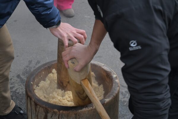 参加者は、杵と臼を使って力を合わせしっかりとお餅をつき、